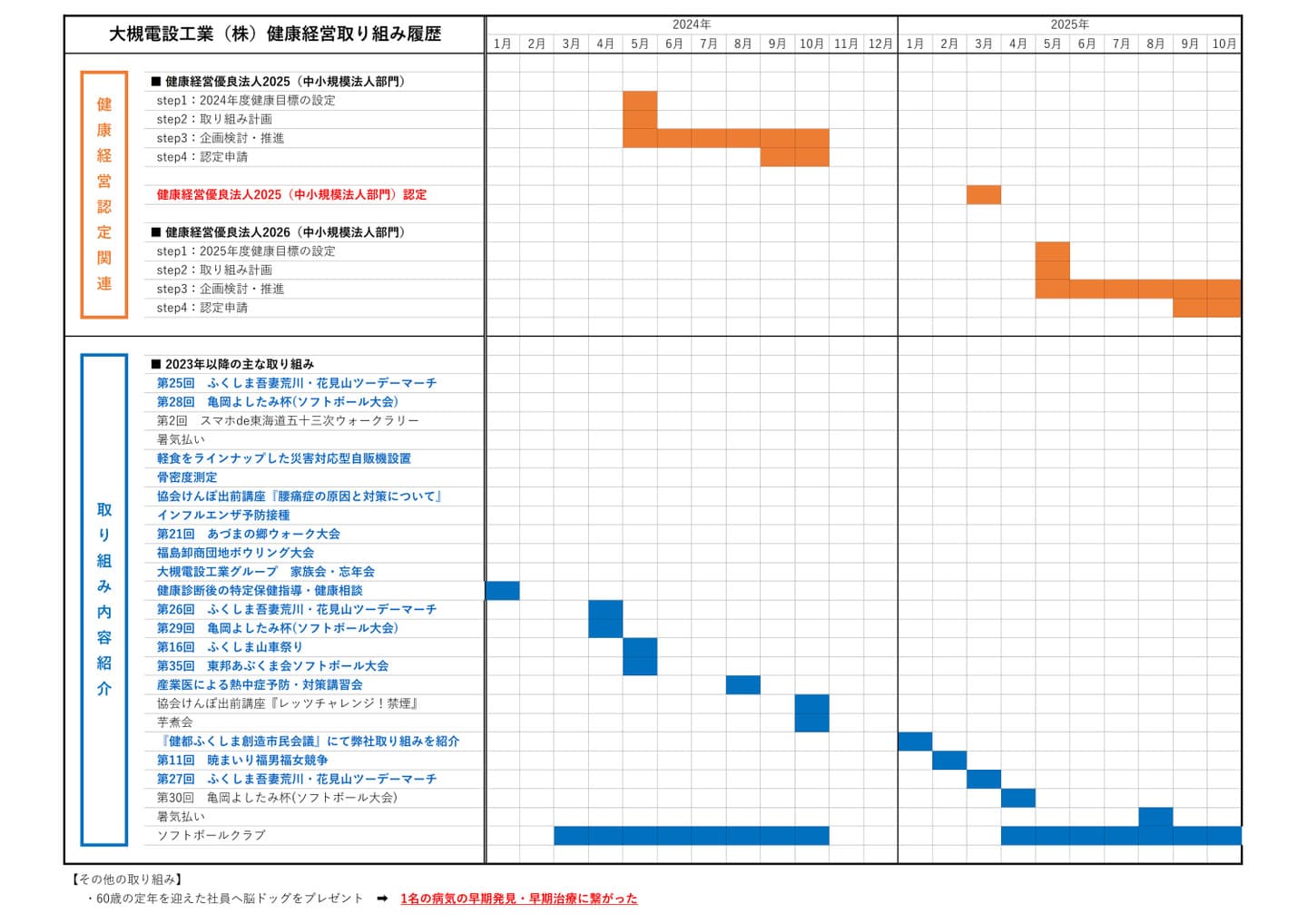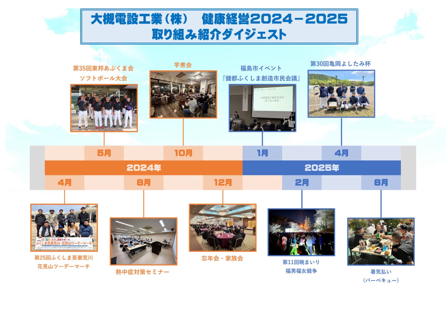 大槻電設工業株式会社は、従業員一人ひとりの心身の健康が最重要課題の一つであることを認識し、従業員の健康の保持・増進と、健康課題について相談し一人で悩まず助け合い、健康で生産的に働き続けられる環境づくりに取り組みます。