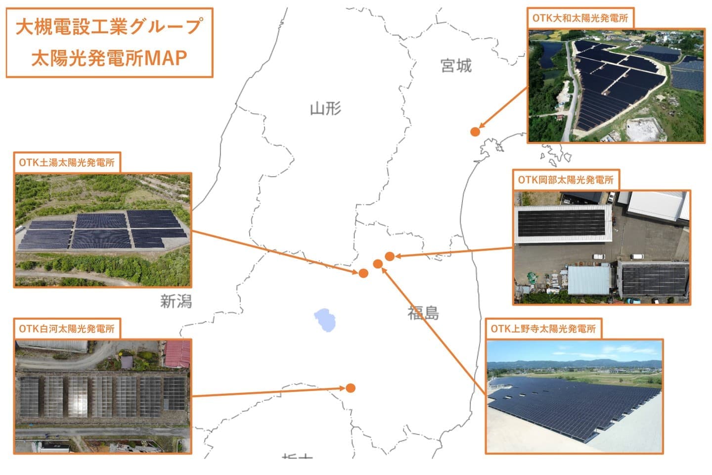 本社の所在する福島市内をはじめとし、白河市や宮城県黒川郡大和町にも自社の太陽光発電所を設置し、運用しています。