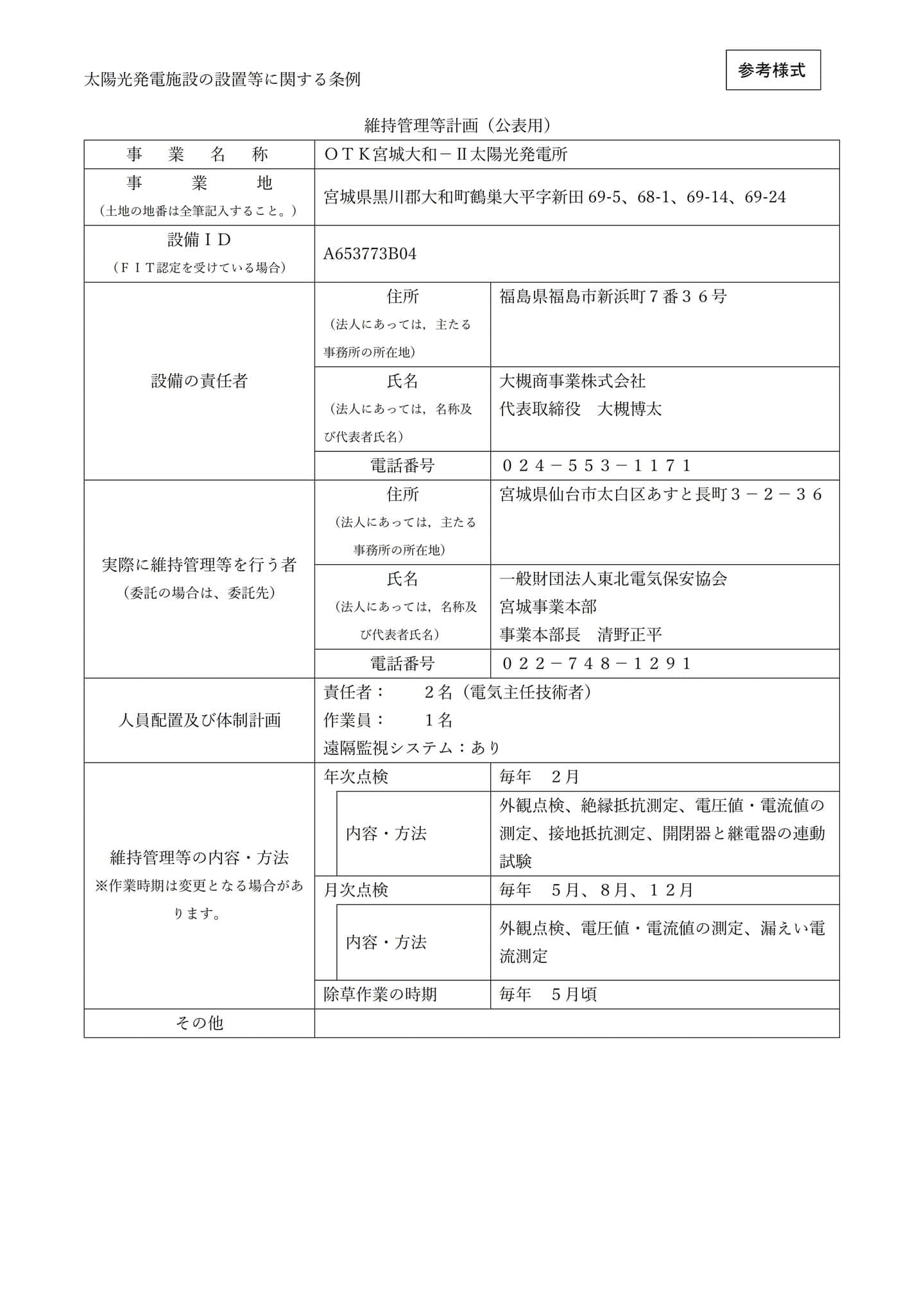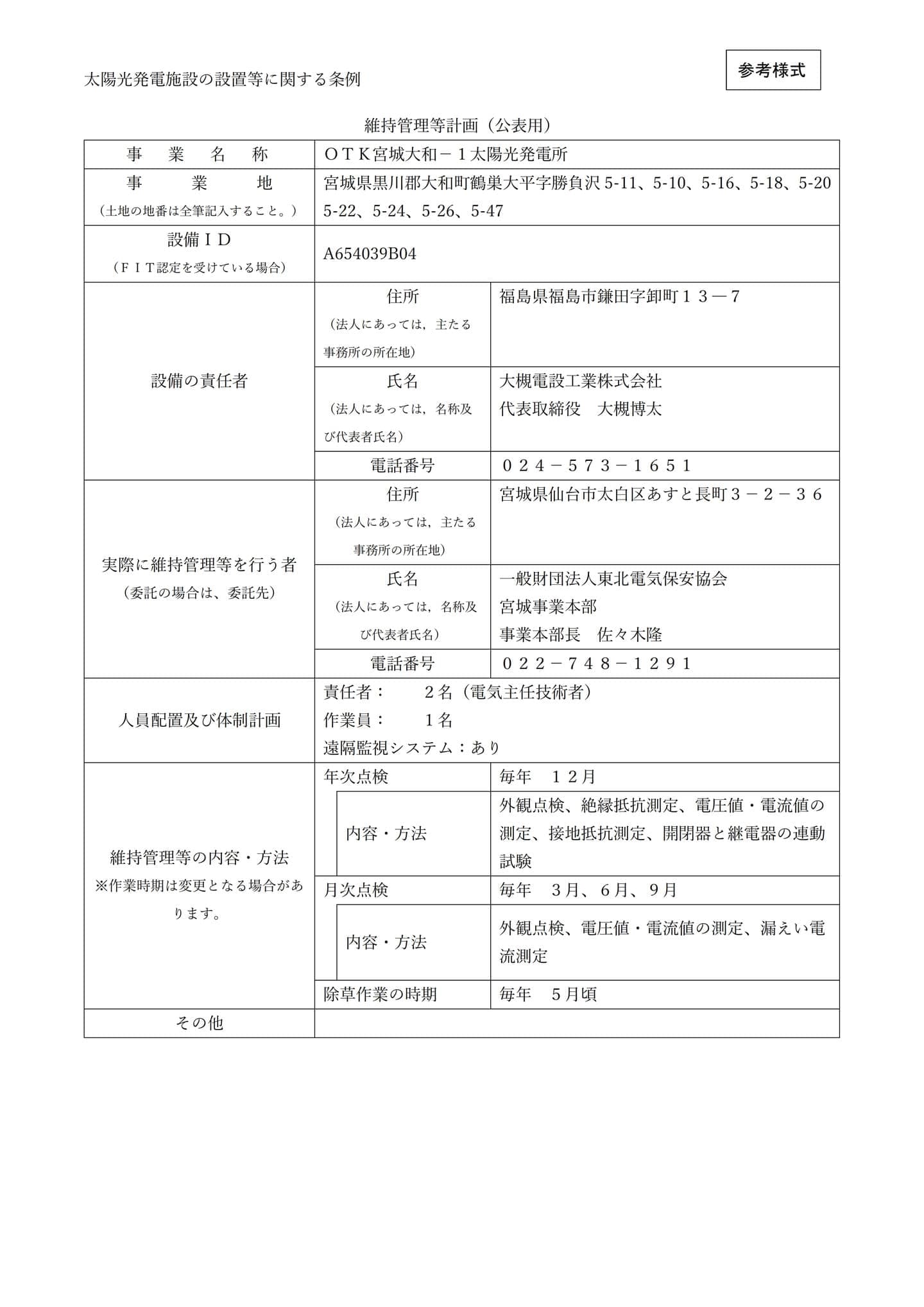 また、宮城県が制定した「太陽光発電施設の設置等に関する条例」に基づき、「OTK宮城大和-Ⅰ太陽光発電所」及び「OTK宮城大和-Ⅱ太陽光発電所」の維持管理等計画を公表致します。