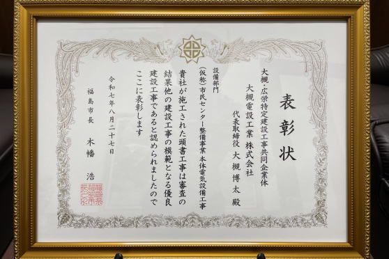 令和7年8月27日に行われた「令和7年度福島市優良工事表彰式」にて、大槻・広栄特定建設工事共同企業体が施工致しました、「(仮称)市民センター整備事業本体電気設備工事」が優良建設工事表彰を受賞しました。 福島市役所本庁舎に続き、市役所複合棟(市民センター)の施工に携われたこと、大変嬉しく思います。 今後も無事故ゼロ災の安全施工と、地域社会への貢献に努めて参ります。 |